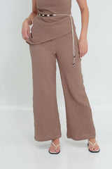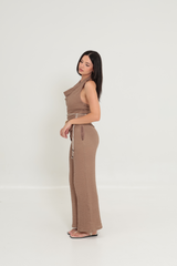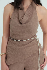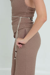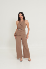 The SANTANA HALTER SET comprises a halter neck top and tailored pants, crafted from textured fabric for comfort and style. Designed with functionality in mind, the pants feature pockets and a side zip. This versatile ensemble is suitable for various occasions, from beach parties to evening outings.